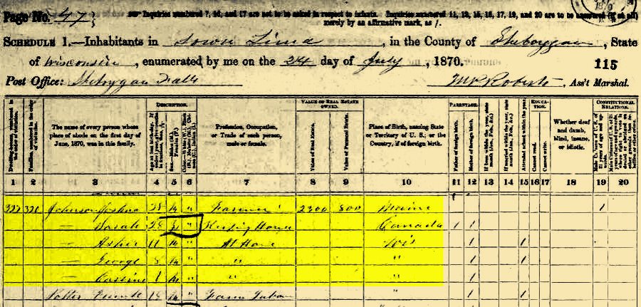 ME–d. 1920, ME) married Sarah Jane Huyck (b. 24 Dec 1842) who was twenty years
