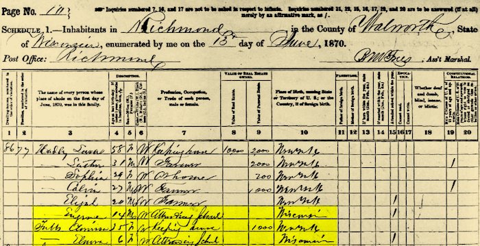 Clarisa's father, Alfred Hadley (1808 VT–3 Oct 1869 WI), married Lura Hadley (1 Mar 1812-16 Dec 1870), 1 March 1832 in Sandy Creek, Oswego, NY. They had eight children: Esther Hadley 1832–; Clarissa Hadley 1835- ; Warner Hadley 1837–1905; Luther Hadley 1839–1916; Sophia Hadley 1840–1876 ; Calvin Hadley 1843–1911; Elijah Hadley 1849–1911; Eugene Hadley 1855–1928. |