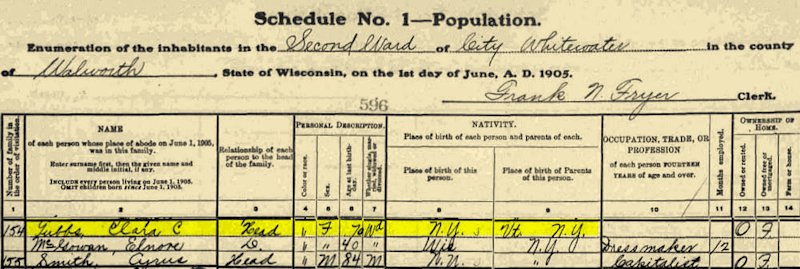 Head--Clara C. Tubbs 70y 1905 Whitewater city, Walworth, WI Female F 70 Widowed White W 1835