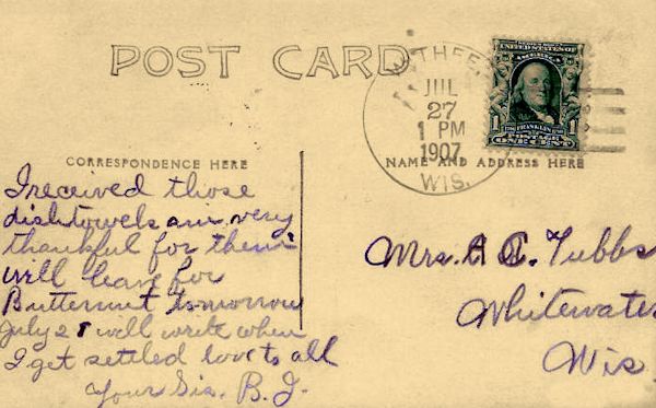 Below--Post Card Message from the card to Mrs. C. A. Tubbs of Whitewater, Wis. from Sis., B. G.