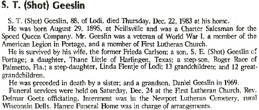 He is survived by his wife, the former Frieda Carlson; a son, S. E. (Shot) Geeslin of Portage; a daughter, Thane Little of Harlingen, Texas; a step-son, Roger Race of Palmetto, Fla.; a step-daughter, Linda Flentje of Lodi; 13 grandchildren; and 12 great-grandchildren.