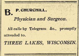 Dr. B. P. Churchill of Three Lakes, has a card in this issue. The Dr. formerly
