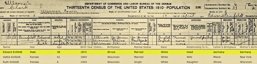 1910 Census, Warner Township, Clark Co., Wisconsin, Einfeldt Family, 19 Apr