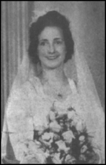 The bride was attired in a gown of white brocaded satin fashioned with a long bodice and full skirt ending in a court train. Seed pearls outlined the sweetheart neckline and the long sleeves were pointed at the srists. Her finger-tip veil was caught to a headdress of orange blossoms and she carried a bouquet of white roses, sweet peas and forget-me-nots.