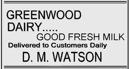 The ad below appeared in the Greenwood Gleaner 3-Nov-1900 and featured D. M. Watson's Greenwood Dairy.