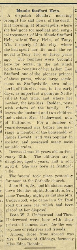 Maude Stafford Hein ========================= A dispatch Monday morning brought the sad news of the death, that morning, at Minneapolis, where she had gone for medical and surgical treatment, of Mrs. Maude Stafford Hein, wife of Tony Hein, of Tony, Wis., formerly of this city, where she had spent her life until the removal to Tony two or three years ago. The remains were brought here for burial, in the lot which hold the remains of her father, Len Stafford, one of the pioneer princes of these parts, who large settlement at Staffordville, two miles north of this city, was, in the early days, as important a point as Neillsville at that time, and where her mother, the late Mrs. Redden, rests with others of the family. She leaves her husband and two children, and a sister, Mrs. Underwood, now of Baltimore. For a number of years deceased was, before her marriage, a member if the household of James Hewett, and was popular in society, and possessed many most amiable traits. Deceased was 29 years old on February 13th. The children are a daughter, aged 6 years, and a son, aged 4. She was born at Staffordville. The funeral took place yesterday forenoon at the Catholic Church. John Hein, Jr., and his sisters came down Monday night, John Hein, Sr., came Tuesday night, as did also Mrs. Underwood, who came in a St. Paul road business car, which had been placed at her disposal. Both W. J. Underwood and Theo. Underwood were here with their private business cars, for the conveyance of relatives and friends. Among those from abroad was Mrs. Rookes of Chicago, former Miss Edna Robbins.
