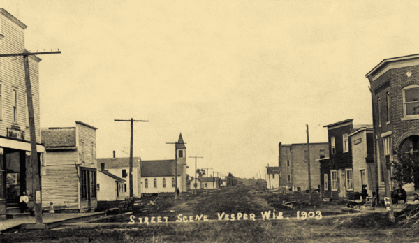 Vesper is an unincorporated village situated in sections 12 and 18, Hansen Township, and has a population of about 300. It is traversed by three railroads, the Chicago & Northwestern, the Chicago, Milwaukee & St. Paul, and the Minneapolis, St. Paul & Sault Ste. Marie, more commonly known as the "Soo." A small stream, Hemlock Creek, runs through the village from northeast to southwest, ultimately joining the Yellow River in Remington Township. The village is ten miles northwest of Wisconsin Rapids, the county seat.