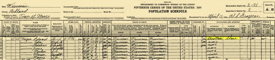 Edward Meyer, Male, 24 yrs. (1896), b. Wis., Cheesemaker at Cheese factory