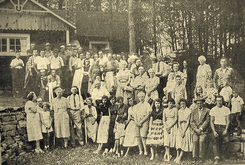 A portion of the friends and neighbors who turned out recently for the annual "Spiegel picnic" is pictured above. The picnic is an annual affair held by Mr. and Mrs. Spiegel of Washburn (fourth and fifth from the left in the bottom row). It is held at their hunting lodge, one building of which is in the background. One of the interesting features of the hunting lodge is the stone "wall of the states" which May be seen in the picture. In it are stones from probably half of the states of the United States. Mostly they were brought by the Spiegel's son, Edgar, who hauls trailer homes into many states. Each time he goes into a new state he brings home a rock for Mrs. Spiegel to put into the wall.