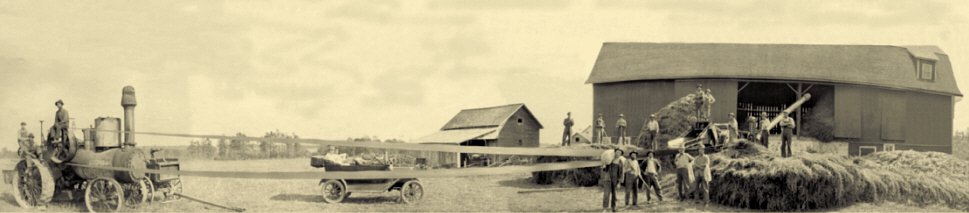 Owner, Edwin Schwarze, can be seen standing on his 1910 Garr-Scott tractor to the far left. Since the engine burned either coal or wood, it was important to operate it a safe distance from the dry grain. The canvas belt which connected it to the separator weighed nearly 300 pounds. This early panoramic photo exaggerates the actual distance and also give an unrealistic curvature to the barn roof. The Model T Ford in the center of the picture was built in 1915 and the superb condition of its Firestone Tires and retractable top suggests it was less than a year old. The farm was located in the heart of Clark County, Wisconsin, at the intersection of county roads O and N, in Warner Township.