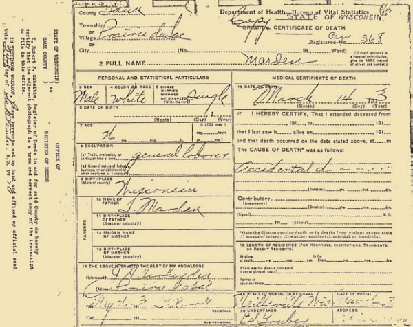 Age: 26 Occupation: General Labor Birthplace: Wisconsin Name of Father: T. Marden Burial: Neillsville, Wis. Date of Burial: March 1913. Undertaker: Ed Gruber