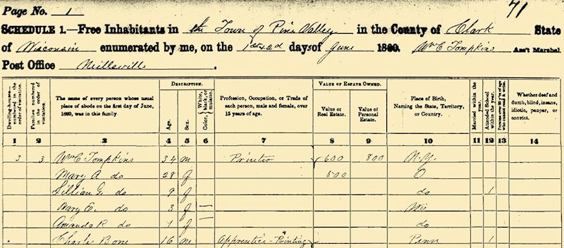 1860 Federal Census, Pine Valley township, Clark Co., Wis., Enumerated by W. C. Tompkins/Assistant Marshal in Jun and July.