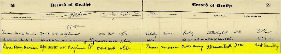 Grove, Henry Harrison died 20 Apr 1905 when his residence was 1649 Virginia St.. He was white, 81 yrs., 4 mo., 1 day, born in PA (19 Dec 1823), and was buried in Oak Cemetery. He was a mason by trade.