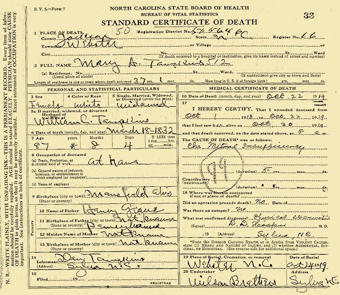 *The informant was Mary's grandson, Daniel D. Tompkins (1890-1950), the son of William F. Tompkins (1861-1896) & Annie Harrison Luck (1866–1960)