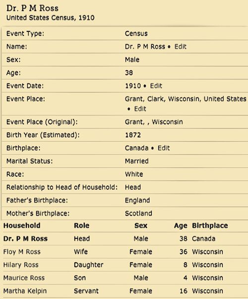 Dr. Peter Maurice Ross (25 Jan 1872, Maryborough, Wellington, Ontario, Canada–24 Augl 1944, Milwaukee, WI)