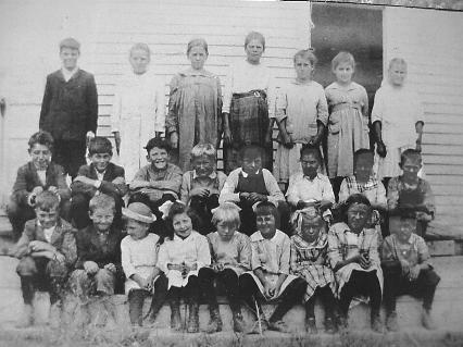 This is a photo of the students at CANNONVILLE RURAL SCHOOL, taken in the fall of 1918 or spring of 1919. Ethel Galbreath Feutz was the teacher at the time. The school was located 7 miles south of Granton on the corner of County Trunk K and highway 73. Lynn Feutz, age 4, in the white suit and hat, attended 1st grade (when this was taken) through 8th grade. He later returned here to teach for 2 years in 1934-35 and 1935-36. The school building was later converted to a house.