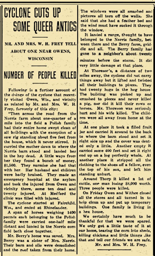 September 21, 1924 — Devastating tornado starting near Augusta near Eau Claire
