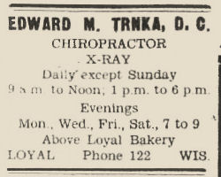 Dr. Edward D. Trnka, Chiropractor, was born in New Prague, Minn., received his degree from the Minnesota Chiropractic college in 1938 and opened his first office in Loyal, Clark County, Wis., the same year. This office was located on the second floor if what was then the Richardson Building. Three years later he moved to his present location at 217 Main St.