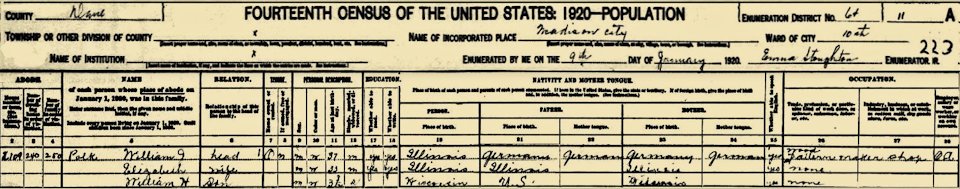 William J Polk Head Male 37 (1882) b. Illinois/both parents b. Germany, Wood