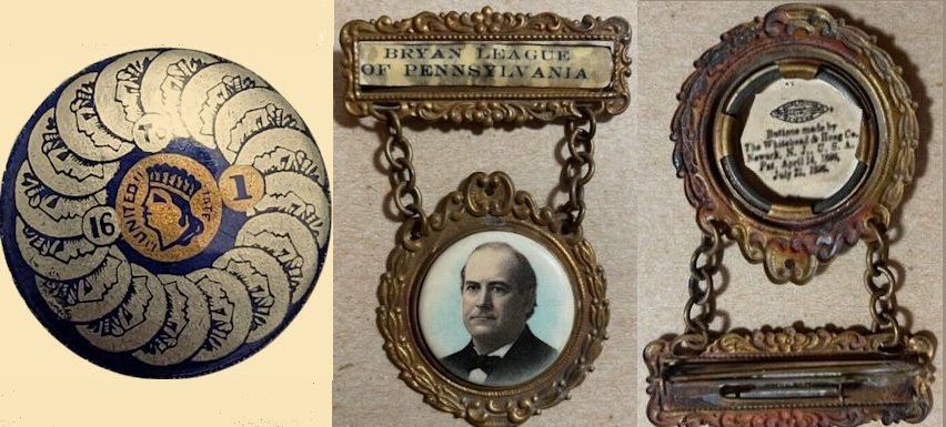 To the left: 1896 stud button promoting William Jennings Bryan and