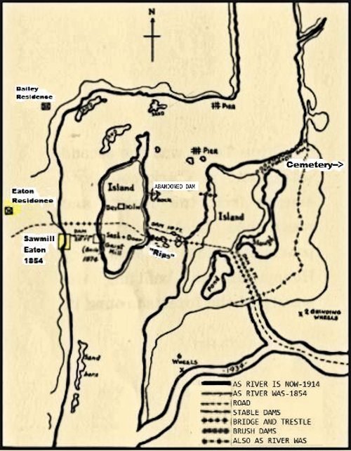Elijah and Olive Eaton had moved from Black River Falls, and were the first known pioneers in what became know as "Eaton Town" and then "Eatonville". Nearly everyone and their residence was slightly northwest of the mill initially constructed by Van Dusen and Waterman. and Moses Clark purchased that mill and operated it for several years and a small community first known as "Eaton Town" emerged around it.