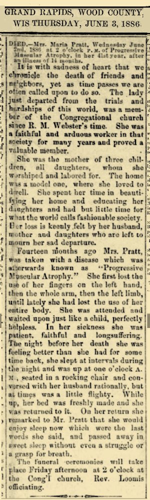 Lately she has been poorly with nervous prostration, but no one considered her condition serious or dangerous. Her intimate friend, Miss Lucy Woodworth, of Pittsville, has been' with her the past week, and nearly every day they have been out riding together. It was thought that Miss Pratt was gaining until a day or two before she died. Monday morning, September 1st, Labor Day, she was taken worse and died at 1:15 a. m., from the effects of a hemorrhage of the brain, it came on so suddenly that her father, who was with her, hardly realized its presence. She passed away apparently in deep sleep. Her loss to her father is great and he realizes that his daughter, house keeper, homemaker and constant companion, has gone from him for ever. He has the heartfelt sympathy of all his friends in this hour of his bereavement. We append the following verses for his comfort:
