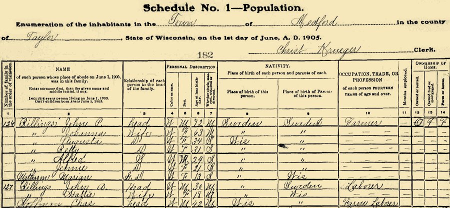 John A Billings 30y 1905 Medford town, Taylor, WI Male M 30 Married White W 1875