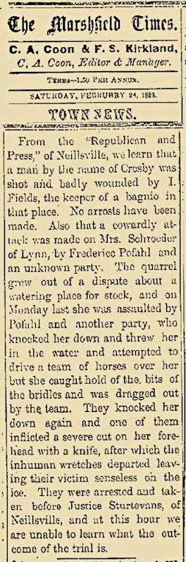 From the "Republican and Press," of Neillsville, Wisconsin, we learn that a man by the name of Crosby was shot and badly wounded by I. (Isaac) Fields, the keeper of a bagnio in that place. No arrests have been made. Also that a cowardly attack was made on Mrs. Schroeder of Lynn, by Frederic Pofahl and an unknown party. The Quarrel grew out of a dispute about a watering place for stock, and on Monday Last she was assaulted by Pofahl and another party, who knocked her down and threw in the water and attempted to drive a team of horses over her but she caught hold of the bits of the bridles and was dragged out by the team. They knocked her down again and one of them inflicted a severe cut on her forehead with a knife, after which the inhuman wretches departed leaving their victim senseless on the ice. They were arrested and taken before Justice Sturtevant, of Neillsville, and at this hour we are unable to learn what the outcome of the trial is. |