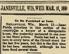 JANESVILLE, WISCONSIN, WED, MAR. 13, 1889 Neillsville, Wis., March 13--Isaac Fields, notorious in this section of the county as a keeper of a disreputable house, was yesterday sentenced to one year here in State Prison. Fields has had a case here every term of the Circuit Court for the last five years, but this is the first time he has been sentenced, although he has been fined several times.