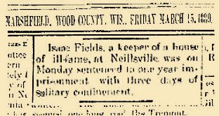 MARSHFIELD, WOOD CO., WIS. Friday, 15 Mar. 1889 Isaac Fields, a keeper of a house of ill-fame at Neillsville, (Wis.) was on Monday sentenced to one year imprisonment with three days of solitary confinement. |