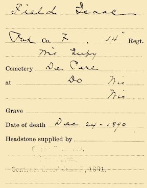 Isaac Fields Also Known As Name Isaac Field Event Type Military Service Military Beginning Rank Private Military Final Rank Private Military Side Union State or Military Term Wisconsin Military Unit 14th Regiment, Wisconsin Infantry Military Company F Note Original filed under Isaac/Field Affiliate Film Number 9