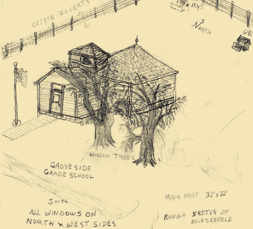 Charmaine Becker--The Groveside school was right up the road from the Hutchins farm. It was drawn from memory by Dale Seefeld who was also a neighbor to the Hutchins and a classmate of my mothers and both attended Groveside. On the upper left hand fence line it says Catlin Property line which was my grandmothers Anna Catlin-Hutchins family farm. :-)