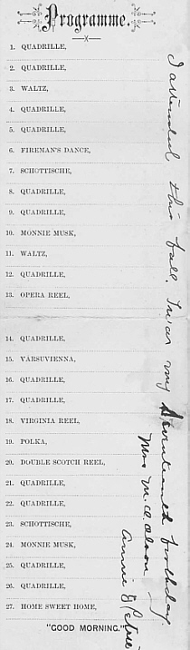The insert of this I.O.O.F. Invitation to the Thanksgiving Ball in Colby, Clark Co., Wisconsin listed the evening program for Thursday, Nov. 28, 1878. Along the edge is a handwritten note which reads: I attended this fall. It was my seventeenth birthday., Mrs. M. Olson-- Annie E. Petrie