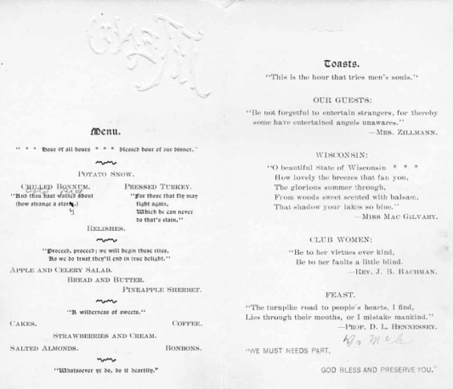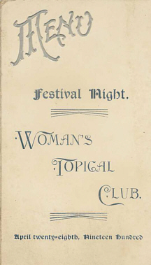 The Thorp, Wisconsin Women's Topical Club held a "Festival Night" April twenty-eighth, Nineteen Hundred. Below is the Jacket for the surprisingly elaborate menu which was served. If you'd like to view what it consisted of, simple click the URL below to see the insert.