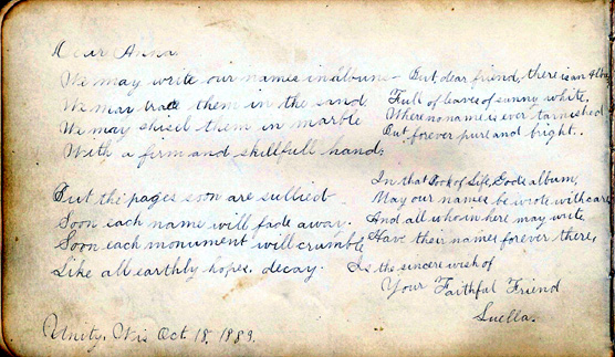 Pictured above is a page from an autograph album which once belonged to my great grandmother, Annie Petrie Olson. Annie's family - Adam Petrie, Elizabeth Moore Petrie and children George Walter, Edith and Annie lived in Unity from 1874 until 1888. The book must have been a Christmas gift in Dec., 1879. I counted 71 pages in the album with inscriptions from friends and relatives (1879 - 1889). Each inscription is hand written, usually with name, date and town. Some of the calligraphy is wonderful. In paging through, I see Unity, Thorpe, Brighton, Chippewa Falls, Concord, Stockbridge, Colby, Eau Claire, Neillsville, Oshkosh, Milwaukee, Withee. Most of the entries are from Unity. I eventually hope to provide scans of every page and this one, dated October 18, 1889 was from Suella of Unity, Wisconsin.