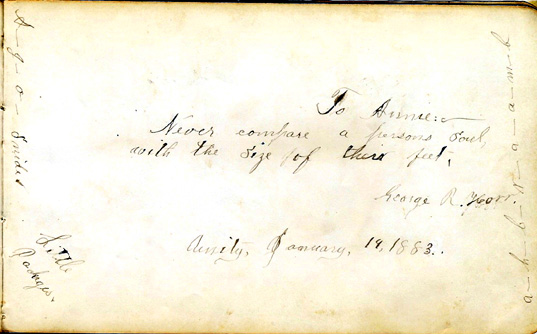 Pictured above is a page from an autograph album which once belonged to my great grandmother, Annie Petrie Olson. Annie's family - Adam Petrie, Elizabeth Moore Petrie and children George Walter, Edith and Annie lived in Unity from 1874 until 1888. The book must have been a Christmas gift in Dec., 1879. I counted 71 pages in the album with inscriptions from friends and relatives (1879 - 1889). Each inscription is hand written, usually with name, date and town. Some of the calligraphy is wonderful. In paging through, I see Unity, Thorpe, Brighton, Chippewa Falls, Concord, Stockbridge, Colby, Eau Claire, Neillsville, Oshkosh, Milwaukee, Withee. Most of the entries are from Unity. I eventually hope to provide scans of every page and this one, dated January 14, 1883, was from George R. Hor?, of Unity, WI.