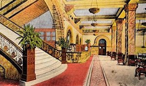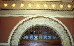 Inside, a palatial lobby opens to the auditorium, where an ornate three-story domed ceiling soars overhead. The walls are decorated with ornamental plaster work, including gold laurels, and a stained-glass window in a Renaissance style glitters behind the stage. A row of carved high-back wooden chairs line the rear wall. Jason Marck/WBEZ