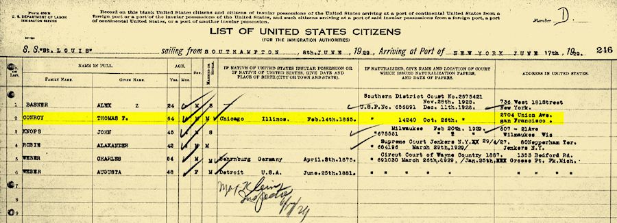 Voyage taken on the Ship "St Louis" [Record] Sailing from Southhampton, San Francisco, CA to New York Port arriving June 17, 1929. while Dr. Thomas Frank Conroy was living at 2704 Union Ave.,