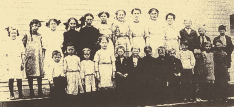 Back Row: Olivia Schuette, May Pipkorn, Viola Goutscher, Clara Horner, Rhoda Pipkorn, Hazel Roohr, Clara Galligan, Teacher Hidee Beeckler, Lily Horner, Esther Goutscher, Art Schuette, Edwin Schuette and Lester Schuette.