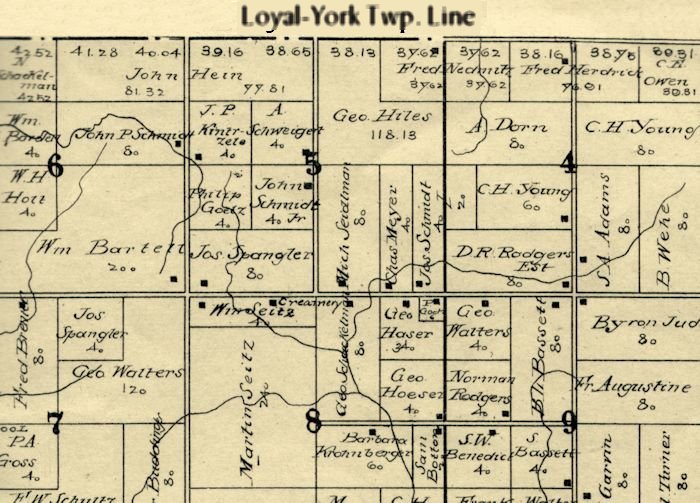 Heintown was located 5 miles south of Loyal and to the west, or in Sections 5