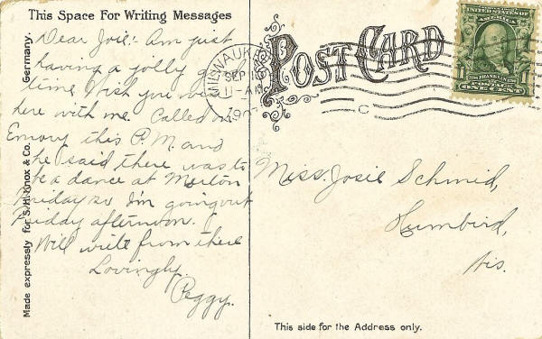 The Post Card above was sent to Josie Schmidt of Humbird, Wis. from Eau Claire, Wis., in 1907 |