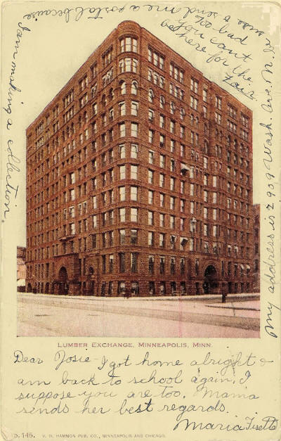 Wis. from Minneapolis, Minn, 5 Sep 1907 from Maria Fisette. Message: Dear Josie - I just got home alright - am back to school again. I suppose you are too. Mama sends her best regards. Maria Fisette My address is 2909 Wash. Ave., N., Be sure to send me a postal because I am making a collection. Too bad you can't be here for the fair. |