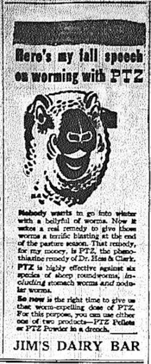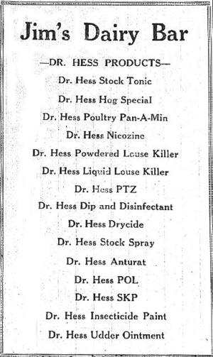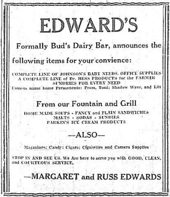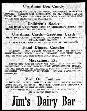 ![]() 9 Mar 1950 If you needed meds for your stock, hogs, poultry or flock--insecticide paint or udder ointment for your cows-- you could buy it at Jim's Dairy Bar while hearing the local news and treating yourself to an ice cream cone before heading out the door. |