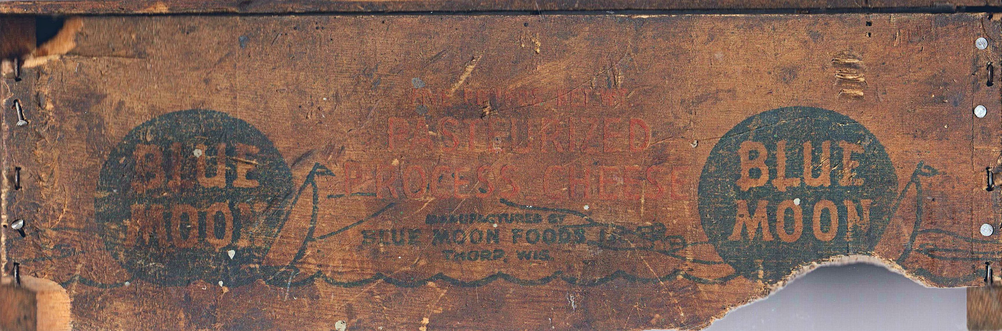 I was cleaning out my garage and came across this old wood cheese box that says Manufactured by Blue Moon Foods Thorp, Wis. Above this it says five pounds net wt.