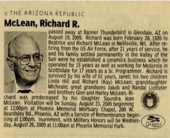 passed away at Banner Thunderbird in Glendale, AZ on August 19, 2009. Richard