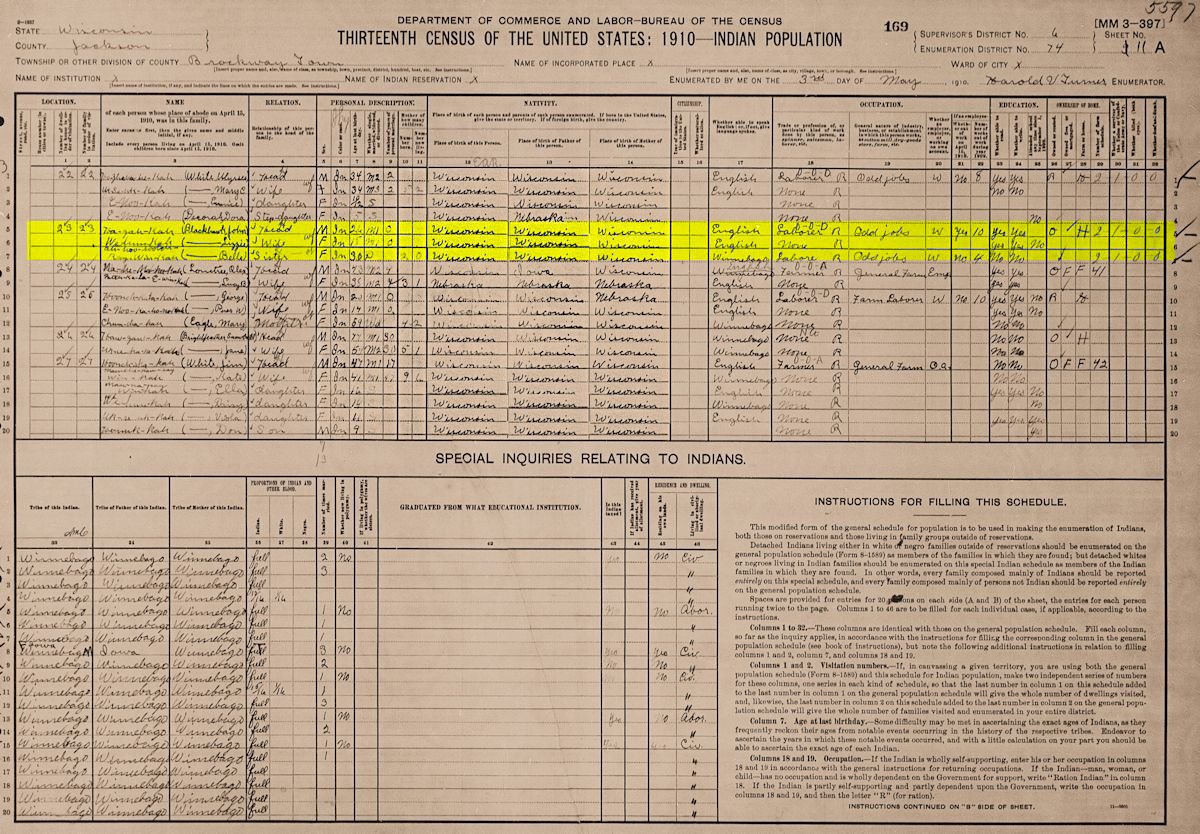 He attended the Winnebago Indian Mission School, Neillsville, Wisconsin in the