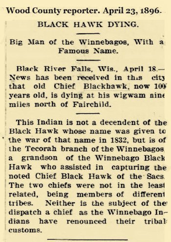 ![]() Chief Blackhawk--Prominent figure years ago. One of the best known and respected characters of the logging days before turn of century in Black River Falls area was Chief Blackhawk, who died about 20 years ago at the age of 80. The Winnebago chief spent the declining years of his life at the Black River Falls Indian Mission. |