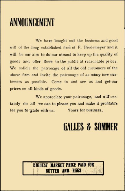 The advertisement below appeared in the Colby Phonograph June 8, 1905 and featured the new Galles & Sommer Merchantile which had formerly been owned by F. Bredemeyer in Colby, Clark Co., Wisconsin.