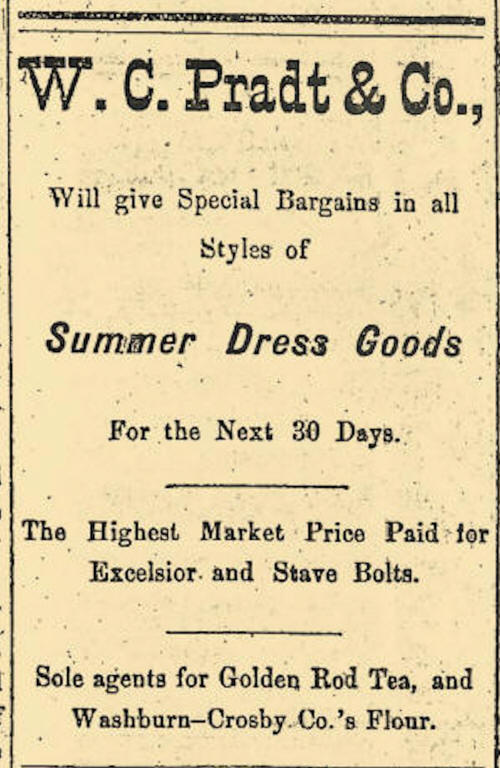 The advertisement below appeared in the Colby Phonograph 23 July 1896. This store was operated by Walter Charles Pradt of Colby, Clark Co., Wisconsin.