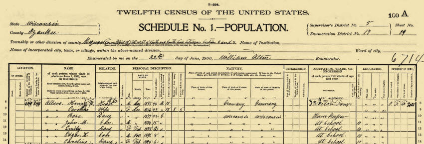 1900 Ozaukee County, Wis. Census for Henry and Caroline Alber's Family
